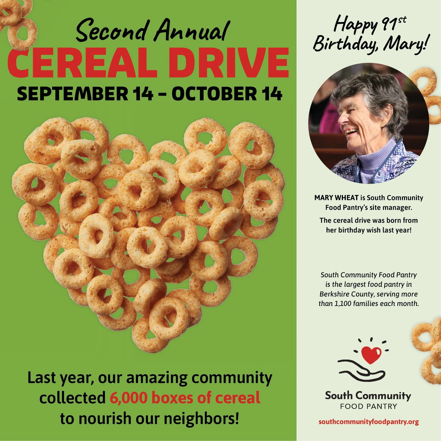 Mary Wheat’s 91st birthday wish… Contribute to our 2024 Fall Cereal Drive — September 14 to October 14!